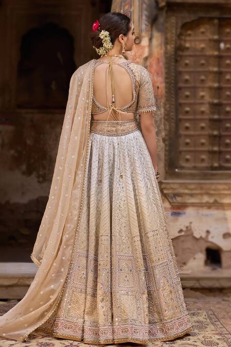 Intricate embroidery along the hemline of the lehenga, Backless design with tie-up detail on blouse, Dupatta features delicate embellishments