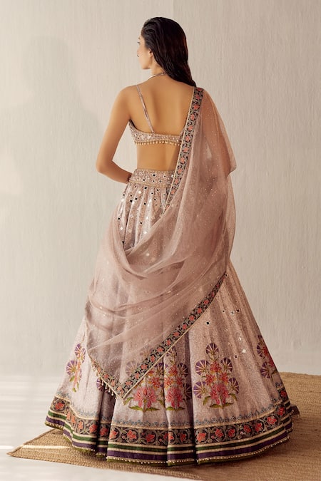 Ash lehenga with attached cancan, floral print & mirror embroidery. Paired with padded blouse & dupatta.