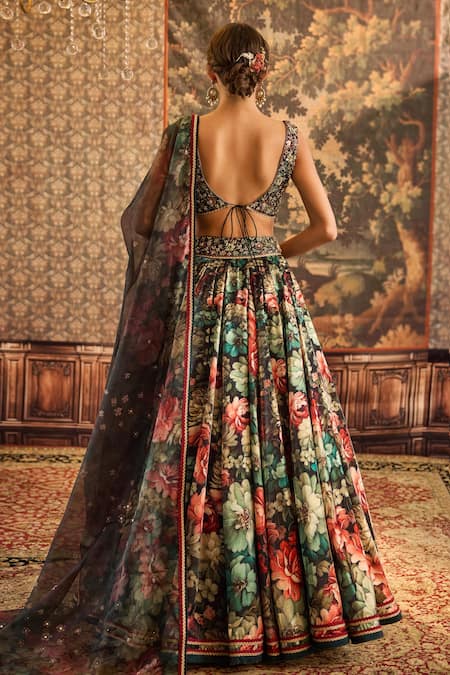 Green lehenga featuring vintage garden print with embroidered waistband. Paired with a padded blouse adorned with sequin, bead, and thread embroidery along with a printed dupatta.