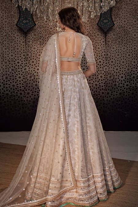 Ivory flared cancan lehenga featuring all over zari leaves embroidery, pearls, and sequin highlights. Paired with a padded square neck blouse and embroidered tulle dupatta.