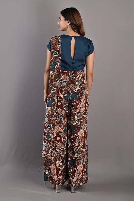 Maroon saree style jumpsuit with floral print, cutout detail & round neck.