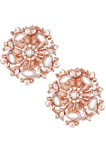 Gold stud earrings featuring a floral design embellished with Swarovski crystals and galactic pearls