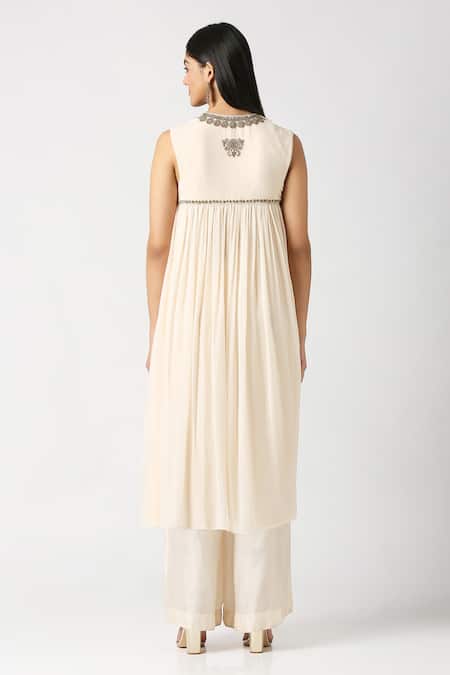 Ivory centre draped kurta featuring marodi hand embroidery on the yoke. Paired with matching palazzo in art dupion fabric.