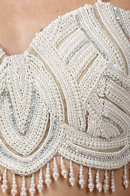 Chaashni By Maansi And Ketan_Ivory Net, Chiffon Pearls, Beads, Embroidered Pre-draped Saree With Blouse _Online_at_Aza_Fashions