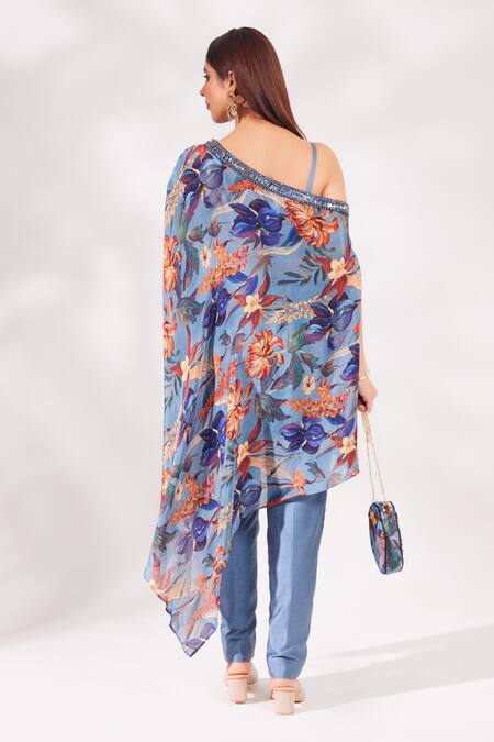 Pale blue kaftan featuring an asymmetric hem and blossom print. Paired with a padded top, pant, and matching bag, embellished with cutdana, sequins, and beads embroidery.
