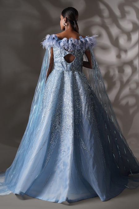 Buy_Chaashni By Maansi And Ketan_Blue Organza Feathers, Sequins Boat Neck Cutdan Embellished Gown_Online_at_Aza_Fashions