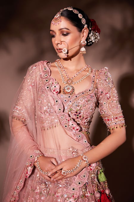Pink lehenga featuring intricate mirror, resham, nakshi, pearl, sequins, and dabka embroidery in floral patterns. Paired with an embroidered padded blouse and net dupatta with a cutout lace border.