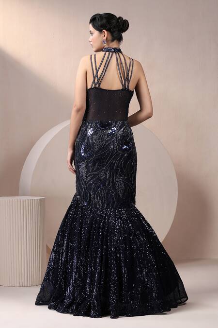 Buy_Chaashni By Maansi And Ketan_Blue Net, Silk Sequins, Cut Work, Stones Halter Neck Embroidered Fishcut Gown_Online_at_Aza_Fashions
