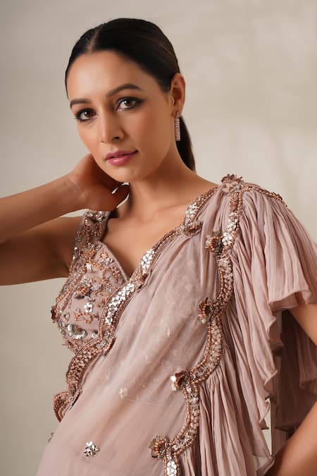 Brown pre-draped saree in georgette featuring pleated draped details and an attached embroidered pallu. Paired with a sleeveless blouse with a sweetheart neckline and embellished with floral sequin, bead, cut dana, and pearl work.