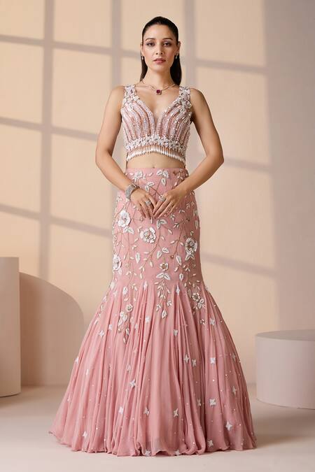 Dusty pink mermaid lehenga featuring floral applique embroidery with cutdana, sequins, and beads work. Paired with a padded blouse adorned with pearl drop and zircons embroidery along with attached drapes.