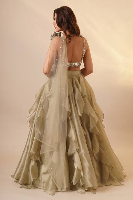 Green lehenga featuring an attached cancan and layered ruffle panels. Paired with a padded blouse adorned with sequin, stone, and cutdana embellishments, along with a semi-sheer embroidered dupatta.
