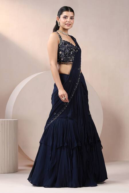 Navy blue layered lehenga saree featuring an attached drape with embroidered scallop hem and plunge back. Paired with a padded blouse adorned with cutdana, sequin, bead, and zircon embroidery.