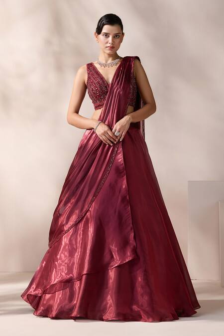 Maroon pre-draped lehenga saree with an attached cancan and layered panel. Paired with a padded blouse featuring cutdana, sequins, stones, pearls and zircons embroidery.