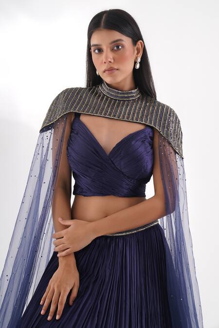 Blue lehenga featuring pleated textured solid base and embellished cape. Paired with a padded sweetheart neckline blouse with a cut-out back panel.