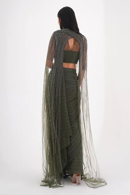 Green pre-draped saree in shimmer lycra featuring crinkled texture and pleated draped details. Paired with a long cape adorned with stripe pattern and intricate bead, stone, and pearl embroidery, along with a high neck sleeveless blouse.