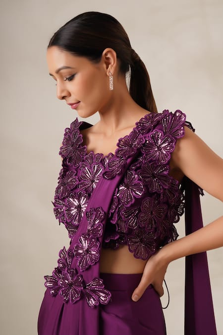 Wine pre-draped saree featuring pleated draped details and an attached embroidered pallu. Paired with a padded blouse adorned with 3D floral applique and resham & cut dana embroidery.
