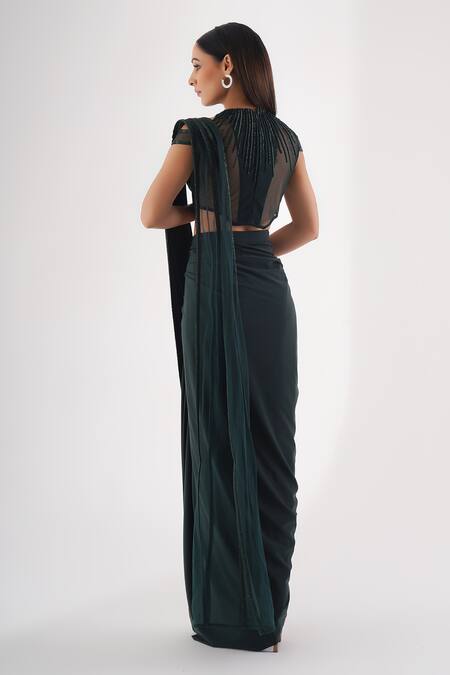 Green pre-draped saree featuring pleated draped detail with an attached embroidered pallu. Paired with a padded blouse showcasing all-over tonal cut dana, pearl, and bead embroidery with a closed neck and cold shoulder sleeves.