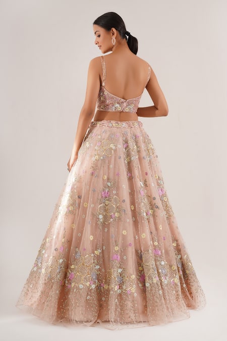 Peach Net Sequins, Beads, Gota Patti Sweetheart Embroidered Floral Lehenga Set