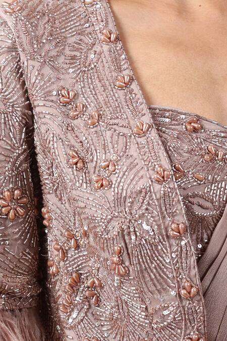 Buy_Chaashni By Maansi And Ketan_Purple Chiffon Beads, Pearls, Ruffle Detailed Pre-draped Saree Set With Jacket