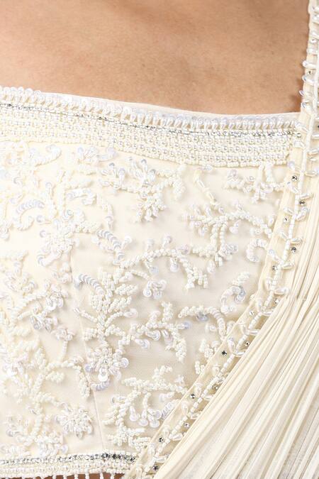 Ivory pre-draped saree featuring intricate bead embroidery and ruffle detailing. Paired with a padded blouse adorned with pearl, bead, cutdana, and sequin embroidery.