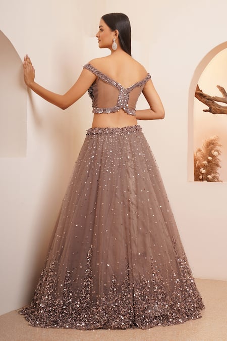 Brown lehenga featuring a sequin, stone, and cutdana embroidered gradient pattern. Paired with an off-shoulder embellished blouse and choker dupatta.