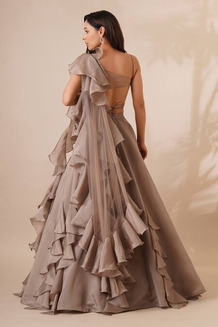 Buy_Chaashni By Maansi And Ketan_Grey Organza Sequins, Cut Ruffle Detail Lehenga With Embroidered Draped Blouse_at_Aza_Fashions