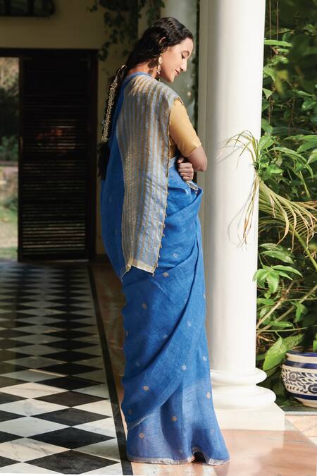Cobalt blue linen saree with silver zari border, mustard polka dot motifs and mustard stripes on the pallu. Comes with a running blouse piece.