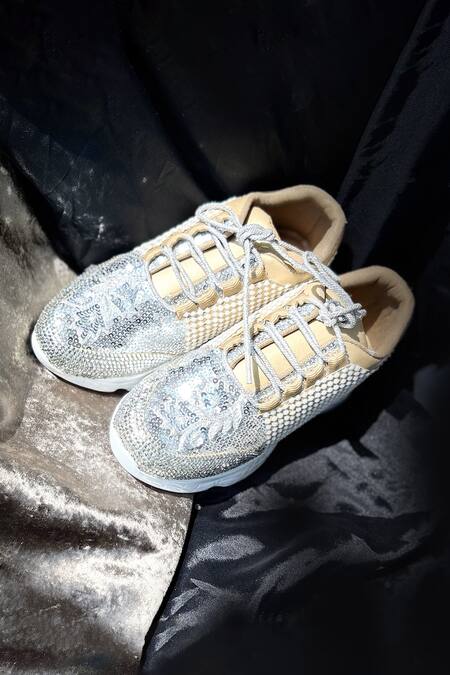 Beige sneakers featuring cutdana, leaf, pearl, and sequins embellishments