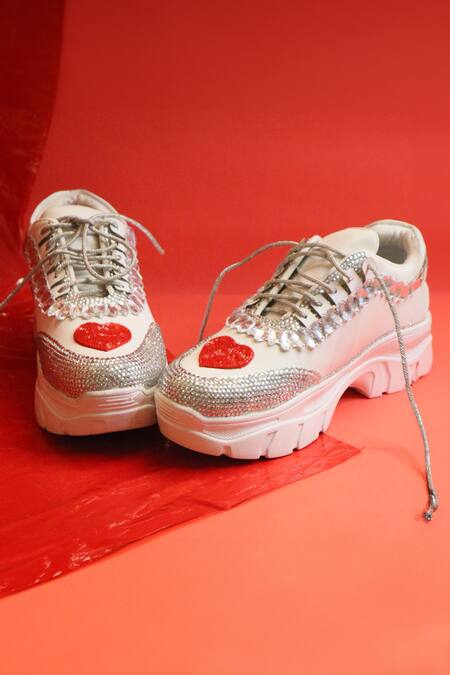 Multi color sneakers featuring dazzling crystal and cutdana embroidery in a heart pattern