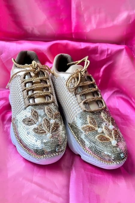 Beige sneakers featuring floral cutdana work, pearls, and sequins embellishments