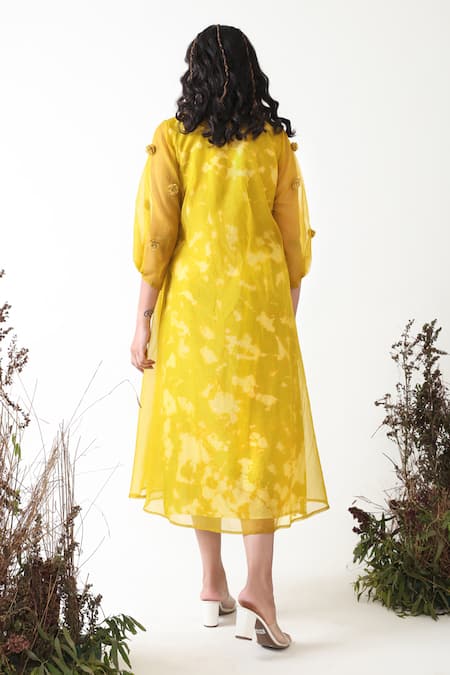 Green tea yellow semi sheer jacket featuring puff sleeves and pompom details. Paired with a sleeveless A-line tie dye dress with a button closure at the back and side slit.
