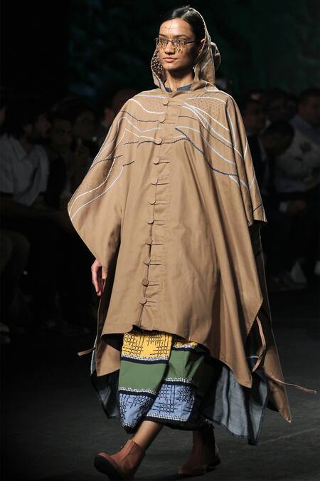 Multi-color tiered maxi skirt with applique work paired with button-front tan brown hoodie jacket. This set comes with denim blue asymmetric shirt.
