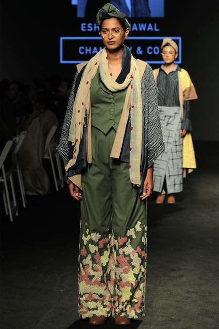 Green waistcoat paired with high-waist pants enhanced with floral motif work. This set comes with reversible denim blue jacket & ombre dyed embellished scarf.