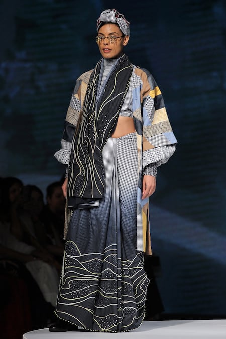Ombre navy blue saree with gingham checks embroidered. Paired with top & overlay jacket.