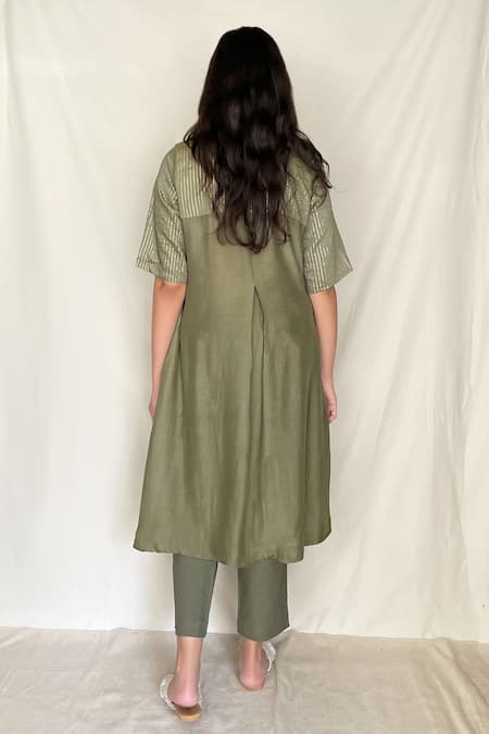 Olive green tunic with zari stripes and hand applique leaves embroidery at the front.