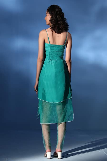 Aqua green dress featuring a sweetheart neckline and resham embroidery. Paired with matching resham thread work stockings.