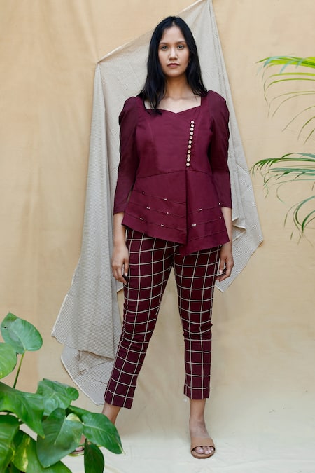 Wine asymmetric peplum top with an offset front placket and French knot detail. Paired with checkered pant.