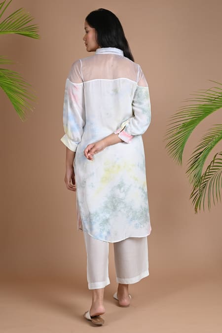Off white kurta with shibori dye detailing & organza shoulder yoke. Paired with straight fit pant.