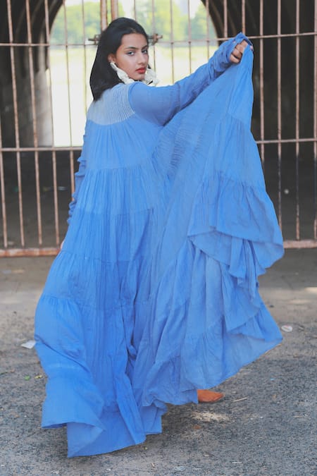 Iris blue flared maxi dress with gathered tiers, striped pattern shoulder yoke & churidar sleeves.