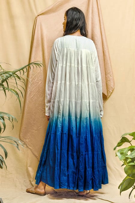 White to blue cotton ombre dress featuring a flowy silhouette and fitted sleeves