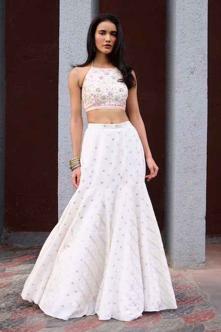 Ivory lehenga featuring floral woven motifs and a flared silhouette. Paired with a multicolour thread embroidered halter neck blouse and a contrast powder blue dupatta with golden lace borders.