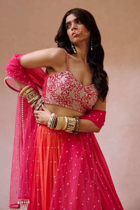 Coral and pink ombre lehenga featuring sequin embroidery. Paired with a padded floral zardosi embroidered blouse and a tulle dupatta.