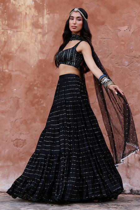 Black lehenga featuring sequin and glass bead embroidery. Paired with a padded embroidered blouse and tulle dupatta.