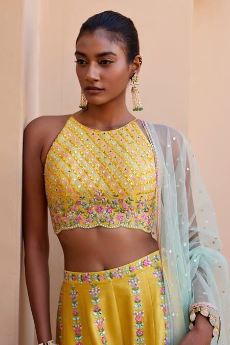 Yellow Net, Silk Embroidery, Mirrors Halter Blossom And Resham Top Palazzo Set