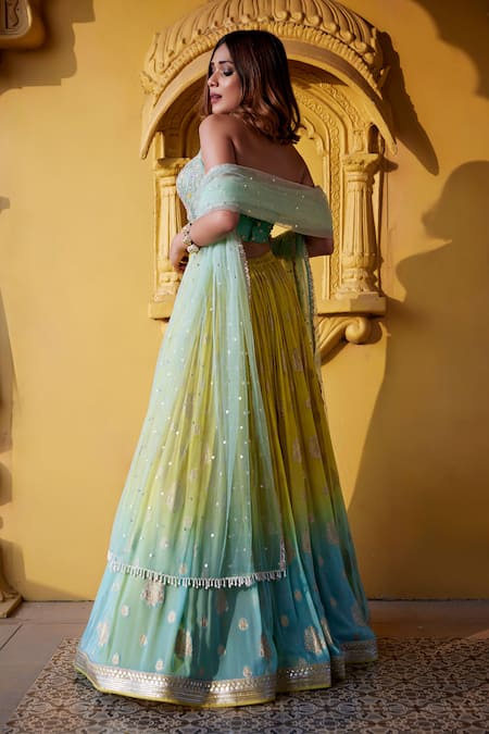 Blue and green shaded georgette jamewar lehenga featuring a flared design. Paired with a padded blouse adorned with glass bead, pearl, and resham embroidery, and a tulle dupatta embellished with sequin and pearl work.