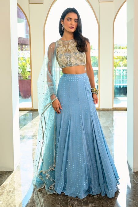 Grey embroidered blouse featuring zardozi and glass bead work with a back cut-out. Paired with a lehenga and a dupatta.