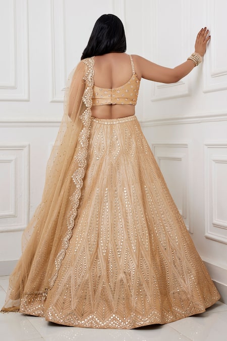 Gold geometric mirror and leather applique embroidered lehenga in dupion silk. Paired with a spaghetti padded blouse and tulle dupatta with scallop border and pearls, cutdana and sequin detailing.