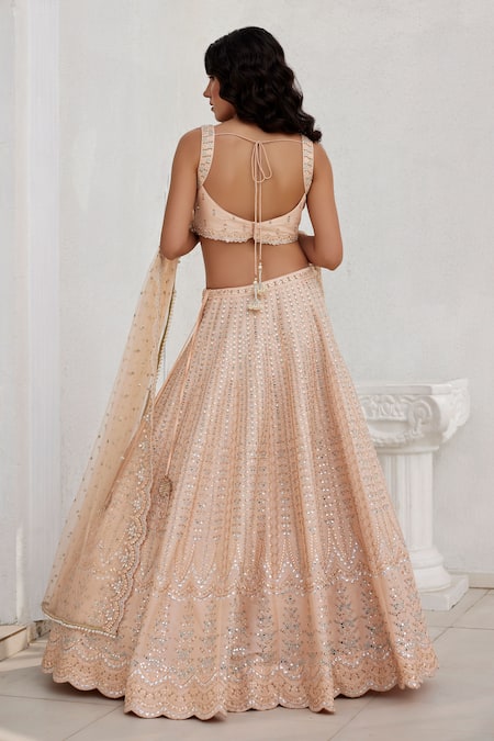 Dusty peach lehenga featuring mirror and leather applique work with attached cancan. Paired with an embroidered padded blouse and tulle dupatta.