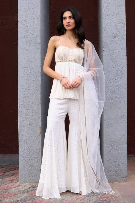 Ivory peplum top featuring pearl and sequin embroidery with a sweetheart neckline. Paired with matching sharara pants and an embroidered lace border dupatta.