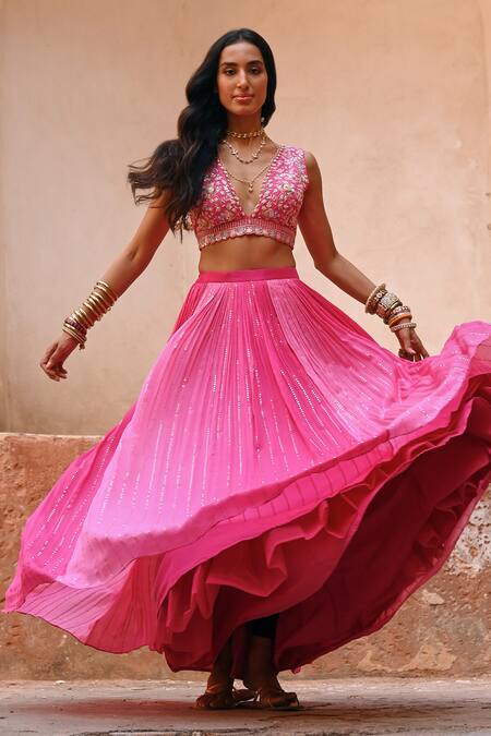 Ombre pink lehenga featuring sequin embroidery and a pleated design. Paired with a padded floral resham and zardosi embroidered blouse along with a tulle dupatta.